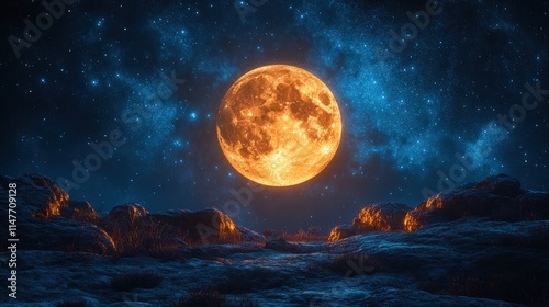 Naklejka premium Orange moon, starry night, rocky landscape.