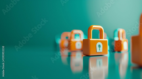 Fototapeta premium Orange padlocks lined up on glossy surface symbolizing unity and multi-level data security
