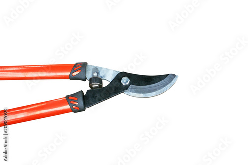 © Amphawan, Obraz premium Orange pruning shears isolated on white background