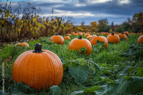© Agang, Obraz premium Orange pumpkins in a grassy field, autumnal scene