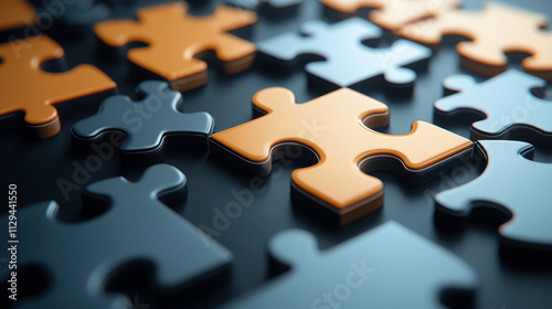 © Inovop, Obraz premium Orange puzzle piece standing out among blue pieces design background