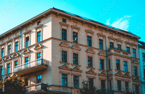 © Novanture, Naklejka premium orange residential building with blue sky in the background