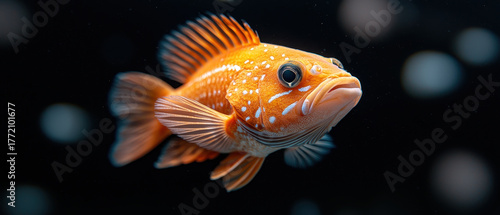 Fototapeta premium Orange rockfish with white spots swims in dark water, close up showing textured scales, fins and eye in sharp focus, minimalist photographic style evoking calm and natural beauty