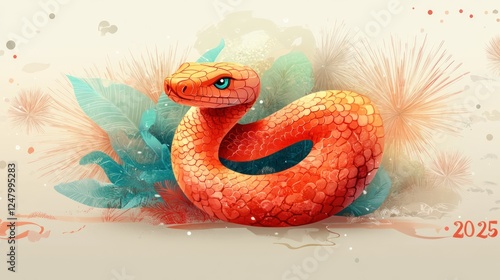 © Almahyra, Fototapeta premium Orange snake coiled among tropical foliage.