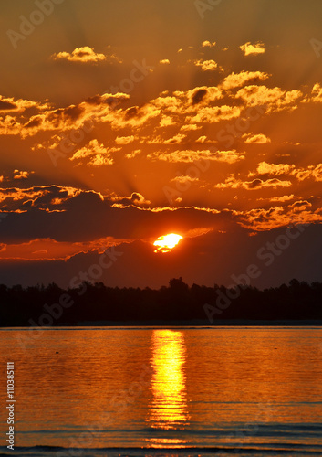 © KHBlack, Obraz premium Orange sun setting behind clouds with reflections on the water.