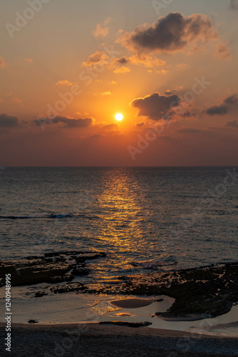 Naklejka premium Orange sunset at a far north beach near Lebanon on the Mediterranean Sea.