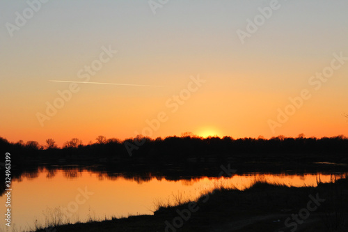 Fototapeta premium orange sunset behind the forest over the river in early spring