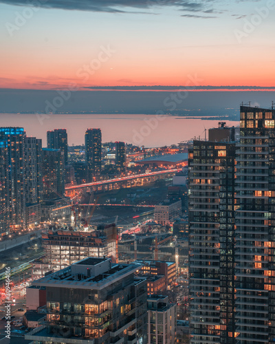 © Lance, Obraz premium orange sunset glow over lake and city