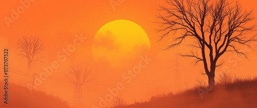 Obraz premium Orange sunset illuminating bare trees in foggy landscape