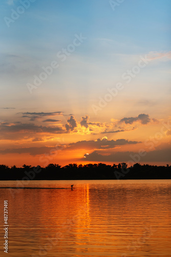Naklejka premium orange sunset on the river with silhouettes