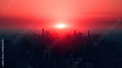© Teerapat, Fototapeta premium Orange Sunset Over City Skyline with Tall Buildings and Horizon Glow