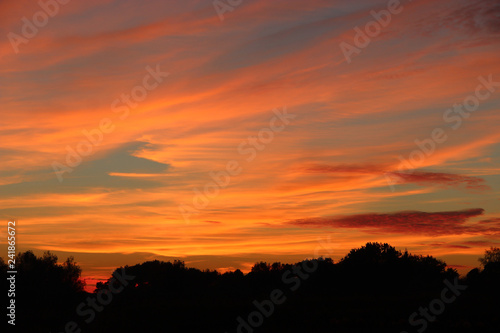 © alexmak, Fototapeta premium Orange sunset over trees. Twilight with bright sunset. Evening landscape