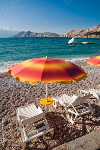 Obraz premium Orange sunshades and deck chairs on Baska beach - Krk - Croatia