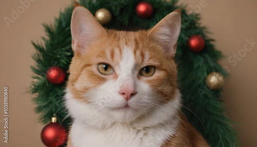 © Mason, Obraz premium orange tabby cat in front of a christmas wreath