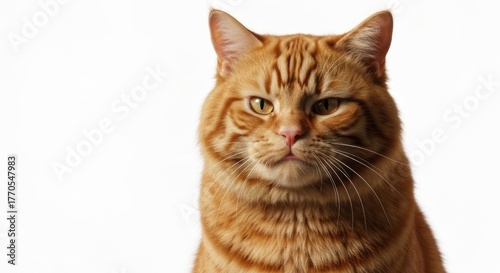 © arif, Obraz premium Orange tabby cat portrait, direct gaze, furrowed brow, isolated on white backdrop
