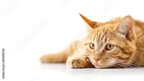 Fototapeta premium Orange tabby cat resting with paw on table on white background