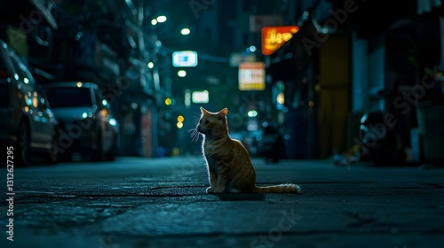 Obraz premium Orange Tabby Cat Sitting Alone on a Dark City Street at Night