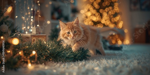 © vxnaghiyev, Obraz premium Orange tabby feline engages with Christmas lights as part of holiday home decoration, highlighting seasonal ambiance