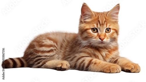 © PNG Artistry, Fototapeta premium Orange tabby kitten lying down with a curious and alert expression isolated on transparent background