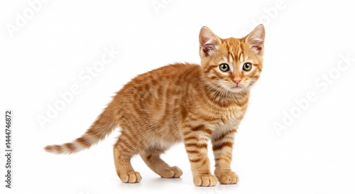 © Donald, Obraz premium Orange tabby kitten standing on a white background, full-body studio view