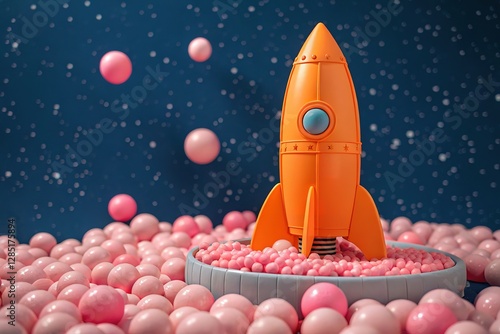 Naklejka premium Orange toy rocket launching from a platform surrounded by pink balls against...