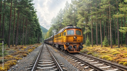 Obraz premium Orange train moving through a dense pine forest on a sunny day, surrounded by...