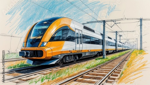 © PabloStock, Naklejka premium Orange Train Sketch on Rails, modern commuter train moves forward on tracks. Hand drawn railway transport and blue sky, light background. Transportation concept.