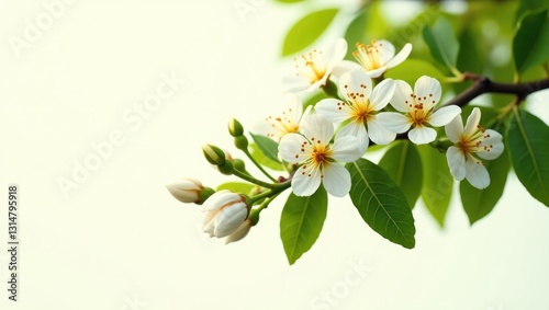 © CreativeBro, Fototapeta premium Orange tree branches featuring flowers, buds, and leaves set against white.