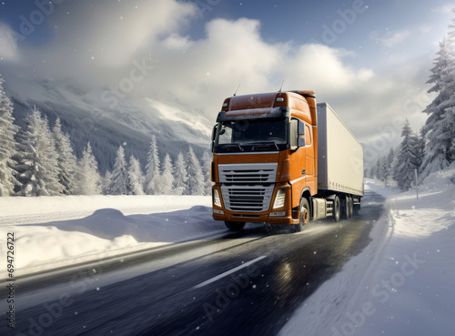 Obraz premium Orange truck is moving on a snowy mountain road, surrounded by snow-covered...