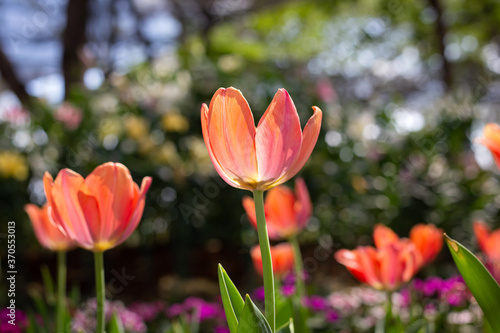 Fototapeta premium Orange tulip flowers lit by sunlight in garden.