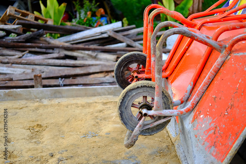 Fototapeta premium Orange Two wheelbarrow or Trolley for construction in site building area -...