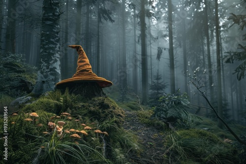 © nsit0108, Fototapeta premium Orange witch hat sits on a mossy tree stump in a mysterious, misty forest, creating a magical and enchanting atmosphere