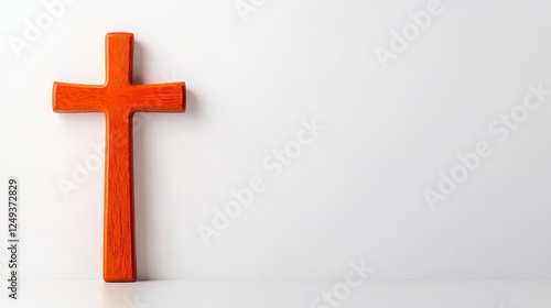 Naklejka premium Orange wooden cross on a white background, simple religious imagery.