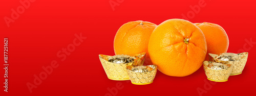 © Atlas, Obraz premium Oranges and gold ingots symbolize wealth for New Year