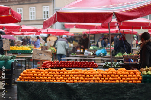 © jelena990, Obraz premium Oranges on display at Dolac Market in Zagreb, Croatia. Selective focus.
