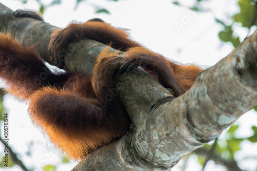 © Tracy, Fototapeta premium Orangutan holding onto tree