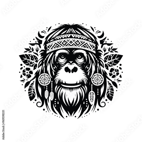 © Cici, Obraz premium orangutan monkey in bohemian black and white silhouette illustration -
