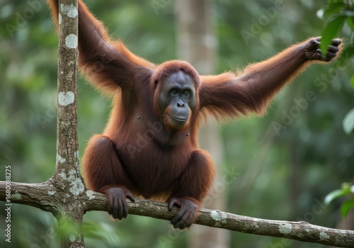 © Creativejulia, Naklejka premium Orangutan sitting on a tree branch with arms outstretched in a lush green forest setting view