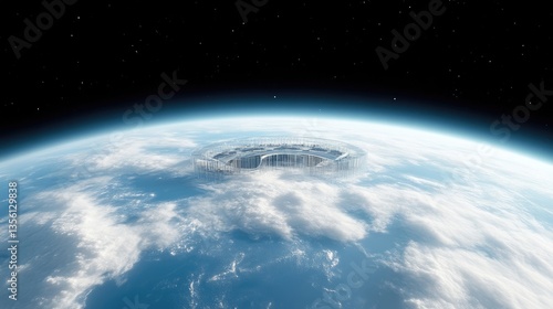 Fototapeta premium Orbital ring structure above Earth. Vast ring-shaped, metallic structure encircles the planet. Vast, detailed, aerial view