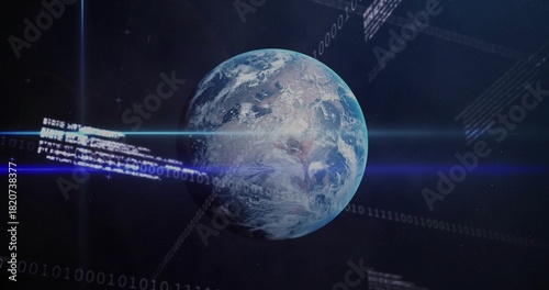 © vectorfusionart, Obraz premium Orbiting Earth glowing with atmospheric halo in space displaying blue lens flares, binary grid