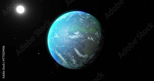Fototapeta premium Orbiting spherical planet Earth displaying clouds in outer space, with bright sun and distant stars