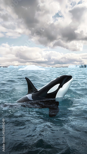 Obraz premium Orca breaching in ocean under cloudy sky