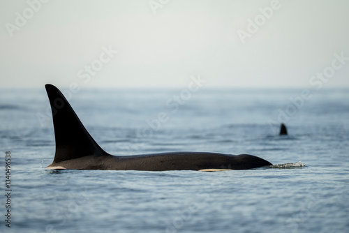 Obraz premium Orca Fins Breaking Ocean Surface in Calm Marine Waters