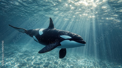 Obraz premium Orca in sunlight, majestic killer whale gliding through the blue ocean depths