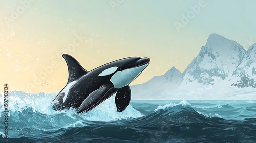 Fototapeta premium Orca leaping out of the water in a serene seascape.