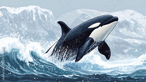 © badjoell, Fototapeta premium Orca leaping through a wave in the icy sea.