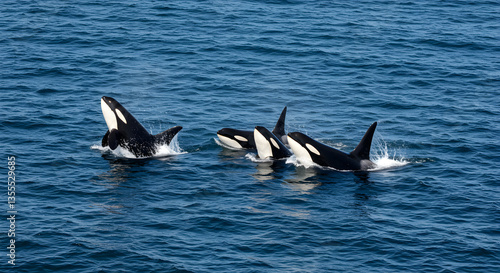 © FADLY, Fototapeta premium Orca Pod Breaching Ocean Surface in Striking Black and White