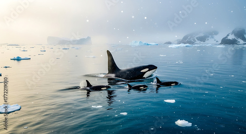Fototapeta premium Orca pod swims in frigid arctic waters with icebergs around