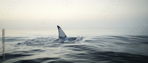 Fototapeta premium Orca's dorsal fin emerges from ocean water.