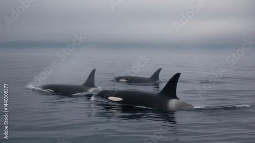 Fototapeta premium Orca Trio: Misty Ocean Surface, Subtle Wake, Coastal Wildlife